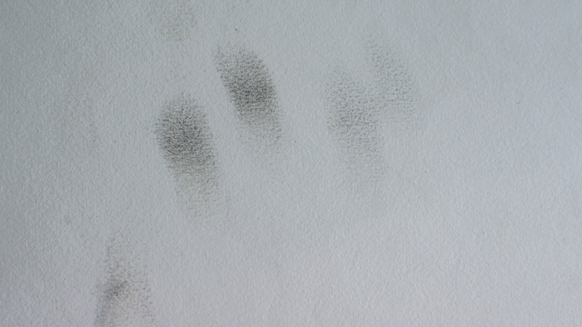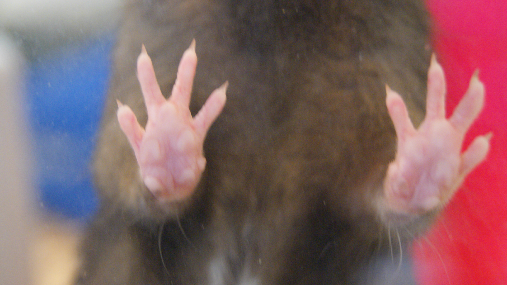 As pegadas dos ratos também podem ser identificadas em superfícies poeirentas. Elas são pequenas, com aproximadamente 1 centímetro de comprimento.